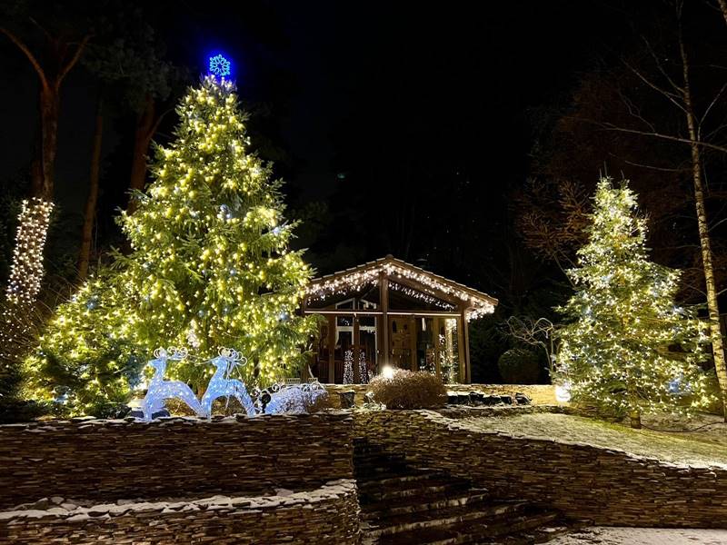 Передняя часть участка: Украшение елей нитями тепло-белого свечения.